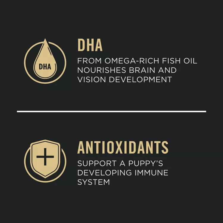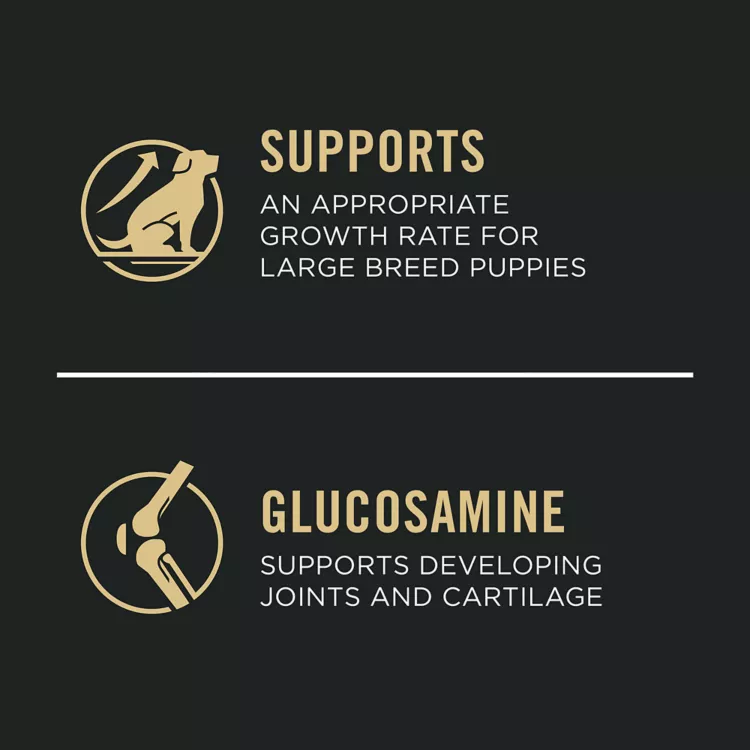 Give your large breed puppy the wholesome nutrition he needs with Purina Pro Plan Brand Dog Food Puppy Large Breed Chicken and Rice Formula dry puppy food. High-quality protein, including chicken as the first ingredient, provides the building blocks he needs to maintain his active lifestyle, and the specially formulated recipe is designed for puppies weighing over 50 pounds at maturity. Every high-quality ingredient in this super-premium dry puppy food is carefully chosen for a specific nutritional or functional purpose, so you can take comfort in knowing your large breed puppy is getting purposeful nutrition. Crunchy kibble and a delicious flavor tempt him to his dish at mealtime, and antioxidants support his developing immune system. Make this dry puppy food part of your puppy's complete and balanced diet, and show him you care about his overall health and happiness.
