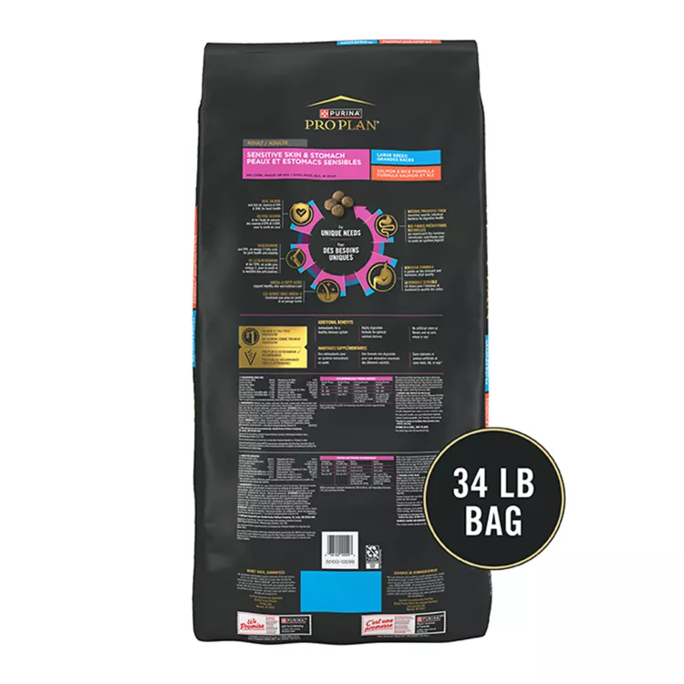 Serve your dog nutrition that performs with Purina Pro Plan Large Breed Sensitive Skin and Stomach Salmon and Rice adult dry dog food. With real salmon as the first ingredient, this high protein dog food delivers savory flavor to capture your dog's attention. Oat meal is gentle on his digestive system, while antioxidants provide immune support. Also included are fish oil for dogs with dog omega 3 fatty acids, DHA and EPA, and glucosamine for joint health and mobility, while omega 6 for dogs supports their healthy skin and lustrous coat. Purina formulates this product with natural prebiotic fiber to nourish specific intestinal bacteria for digestive health. This wheat-free and soy-free recipe is made without artificial colors or flavors. Offer 100 percent complete and balanced nutrition to your dog with Purina Pro Plan Large Breed Sensitive Skin and Stomach Salmon and Rice adult dry dog food.