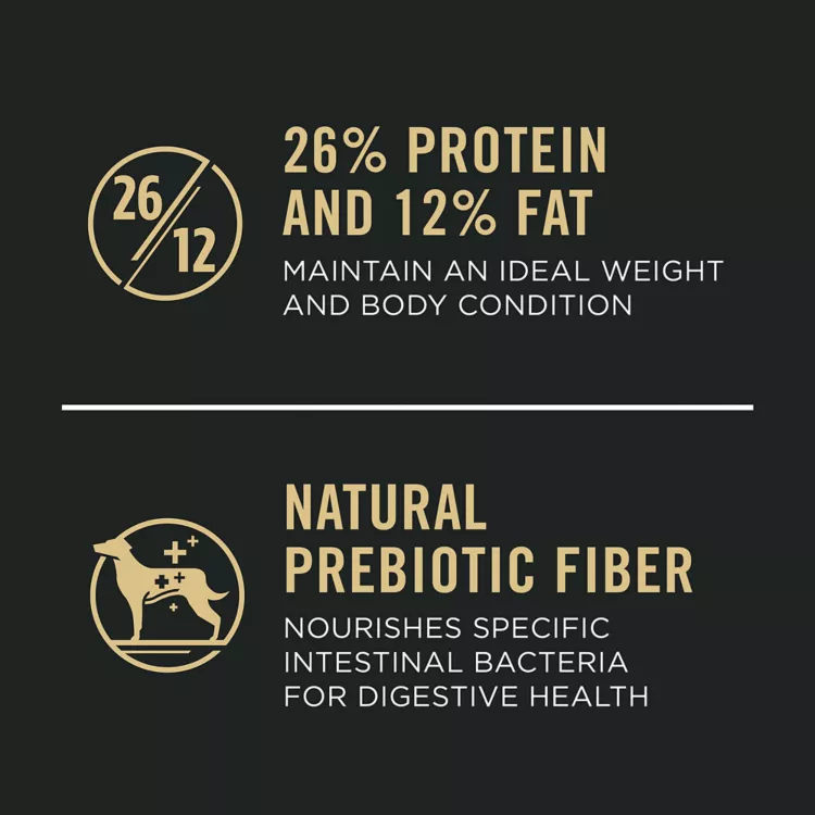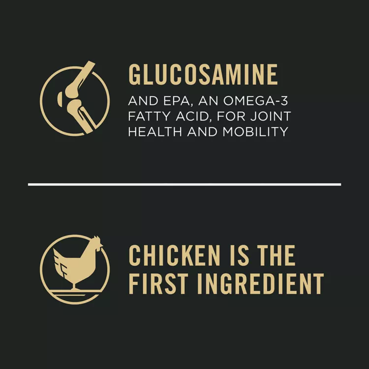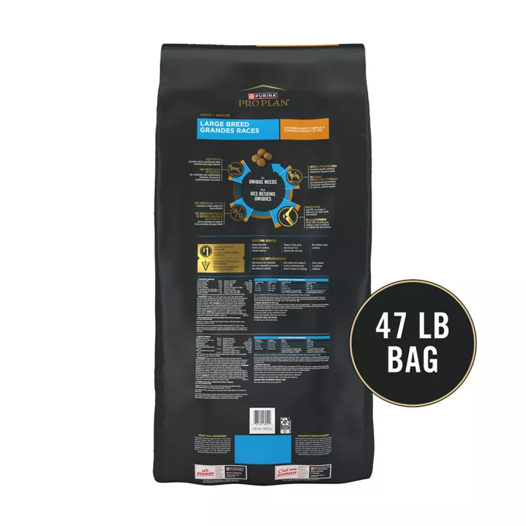 Features & Benefits: Glucosamine and EPA, an omega–3 fatty acid, for joint health and mobility. High protein promotes muscle conditioning when combined with proper exercise. High level of protein, combined with proper exercise, helps promote muscle conditioning, 100 percent complete and balanced adult dog food nutrition. Natural prebiotic fiber nourishes specific intestinal bacteria for digestive health. Vitamin A and omega–6 fatty acids to nourish skin and coat. Large breed dog food for adult dogs over 50 pounds. Spoil your pet with Purina products. Reward yourself with points on every purchase. Download the myPurina app today.