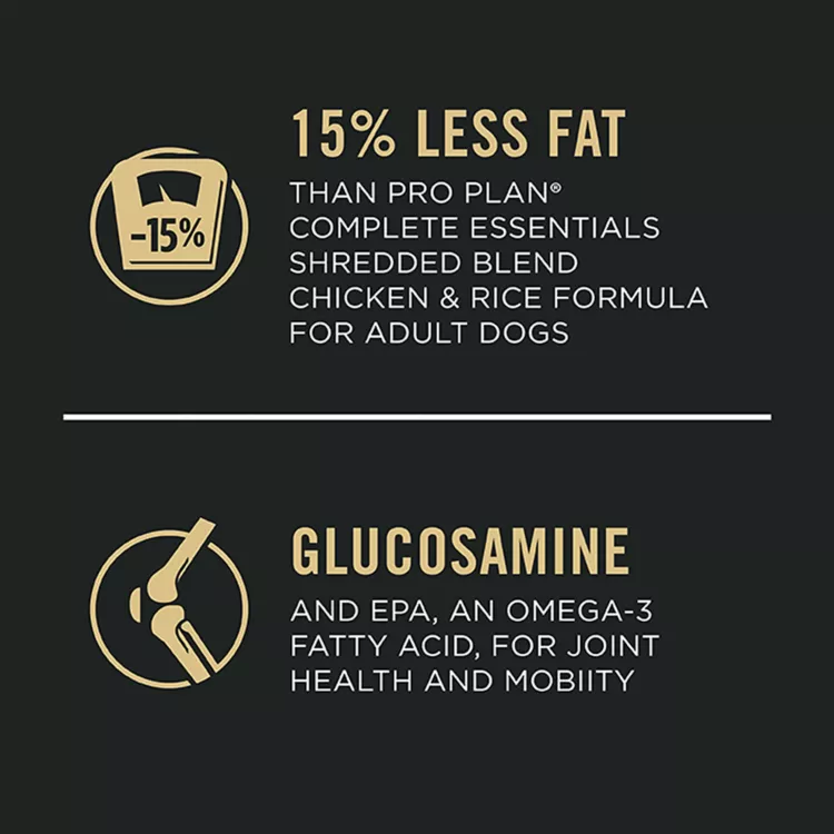 Key Benefits:  Dry dog food for overweight and less active adult large breed dogs over 50 pounds, High protein dog food formula, with real chicken as the first ingredient and fortified with live probiotics for dogs to help promote gut microbiome resilience, Large Breed Dog Food Formula. Optimal protein-to-fat ratio helps maintain muscle mass during weight loss, Natural prebiotic fiber for dogs from wheat bran helps promote digestive health. Contains glucosamine and EPA for joint health support, This Purina Pro Plan weight management dog food is proudly manufactured in Purina-owned U.S. facilities, Spoil your pet with Purina products. Reward yourself with points on every purchase. Download the myPurina app today