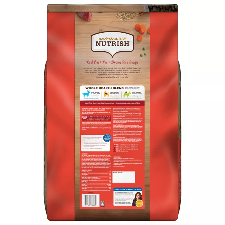 Rachael Ray Nutrish Real Beef, Pea & Brown Rice Recipe Dry Dog Food, is a delicious, super premium dog food recipe made the Rachael Ray way - with lots of love and only the best, high-quality ingredients. The #1 ingredient is real beef, which is a good source of protein, helps support healthy organs and helps maintain lean muscle mass. Peas and brown rice, a highly digestible carbohydrate that's low in fat but high in fiber, help support healthy digestion while providing your dog with a source of energy. Meanwhile, chicken fat is a naturally rich source of omega-6 and omega-3 fatty acids to help support healthy skin and a healthy coat. All in a tasty recipe dogs love! Better yet, a portion of the proceeds will be donated to The Rachael Ray Foundation to help animals in need. Order now to feed your fur baby well and help make a difference.