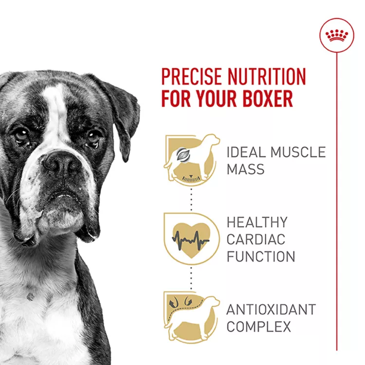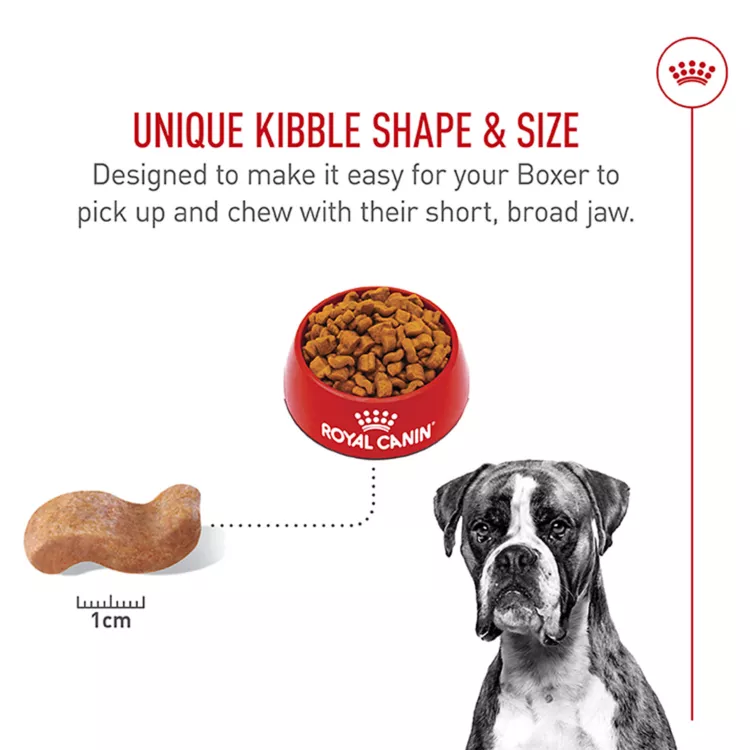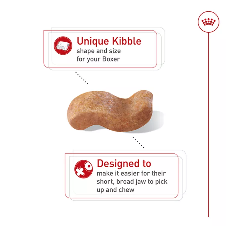 Royal Canin Boxer Adult dog food is tailor-made nutrition created just for your pure breed Boxer. Whether you have a fawn, brindle, or white purebred, this exclusive breed-specific diet is uniquely formulated for your Boxer, with the specific nutrients to help them thrive. The unique wave-shaped kibble is specially designed for your Boxer's short muzzle and jaw, making it easy for them to pick up and chew. Precise protein content and L-carnitine support healthy muscles. Essential nutrients like taurine, EPA, and DHA help maintain heart health. And an exclusive antioxidant complex supports cellular health throughout your Boxer's incredible body - head to tail. Mix in or complement with Royal Canin Boxer wet dog food for a meal thatâs sure to have them licking their chops.