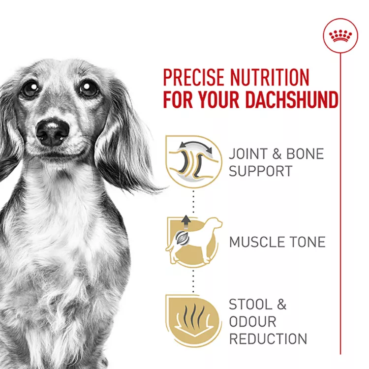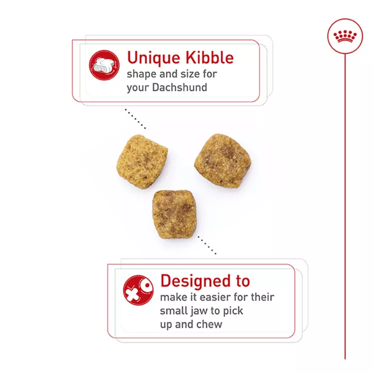 Royal Canin Dachshund Adult dog food is tailor-made nutrition created just for your pure breed Dachshund. Whether you have a miniature or standard Dachshund, this exclusive breed-specific diet is uniquely formulated for your Dachshund, with the specific nutrients to help them thrive. The customized small-shaped kibble is specially designed for your Dachshund's pointed muzzle and tiny jaw, making it easy for them to pick up and chew. An appropriate combination of calcium and phosphorus supports bone and joint health and an adapted energy content helps them maintain an ideal weight. Precise levels of protein and L-carnitine maintain muscle tone. And highly digestible proteins and precise fiber content support healthy digestion to promote optimal stool quality and reduce unpleasant stool odors. Mix in or complement with Royal Canin Dachshund wet dog food for a meal that's sure to please your perky little sausage dog. Once your Dachshund is over 8 years old, transition them to Royal Canin Dachshund Adult 8+ dry dog food for precise nutrition into the golden years.