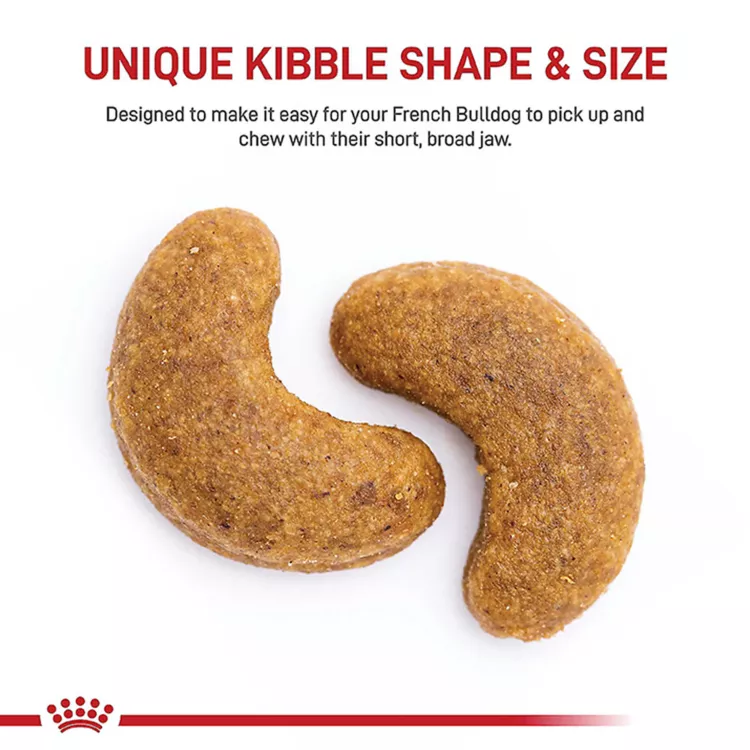 Royal Canin French Bulldog Adult dog food is tailor-made nutrition created just for your pure breed French Bulldog. This exclusive breed-specific diet is uniquely formulated for your French Bulldog, with the specific nutrients to help them thrive. The customized curved-shaped kibble is specially designed for your Frenchie's short muzzle and underbite, making it easy for them to pick up and chew. Precise protein content and L-carnitine support healthy muscles. Exclusive nutrients reinforce the skin barrier for healthy skin. And a combination of highly digestible proteins, precise fiber content, and high-quality carbohydrate sources supports healthy digestion to help decrease flatulence and unpleasant stool odors.