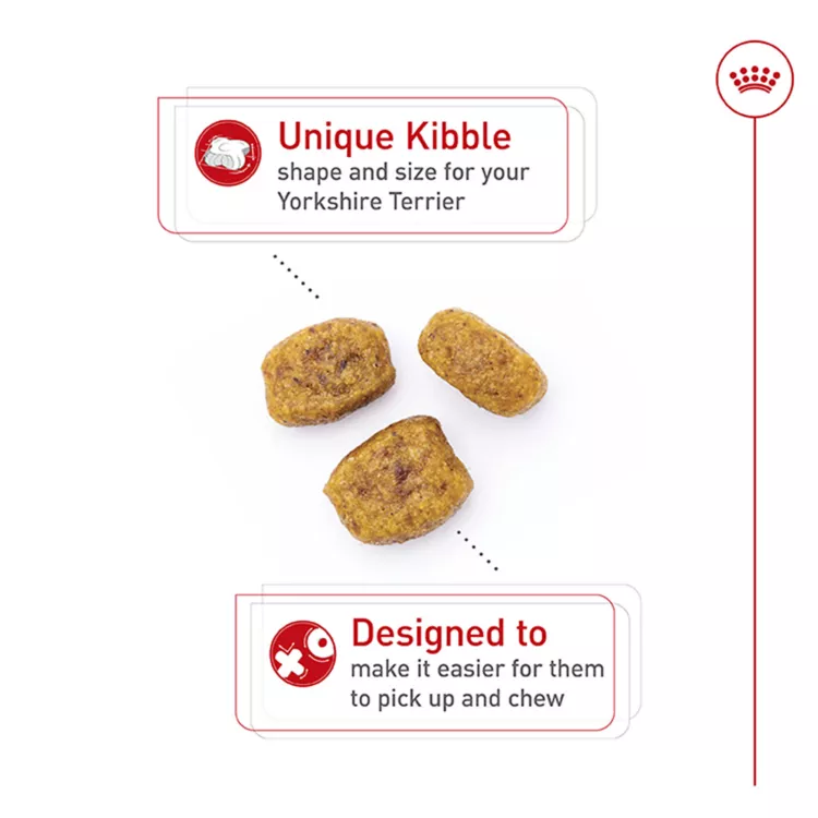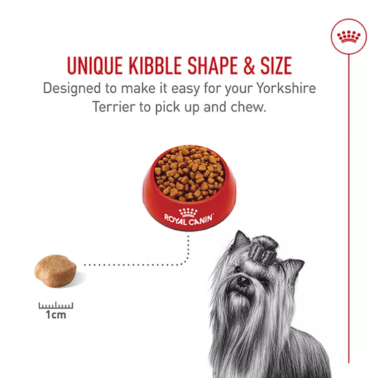 Royal Canin Breed Health Nutrition Yorkshire Terrier Adult Dry Dog Food can help give your adult Yorkie the tailored, complete, and balanced nutrition he needs. A Yorkshire Terrier's coat is unique, as it grows in continuous single strands, which is why Royal Canin delivers biotin and omega-3 and -6 fatty acids to help keep your Yorkshire Terrier beautifully soft and luxurious. With targeted nutrients including vitamin C, EPA, and DHA, this dry dog food helps support your small breed dog's vitality as he faces the first signs of aging. Plus, the small kibble shape and size help reduce tartar formation by encouraging him to chew.