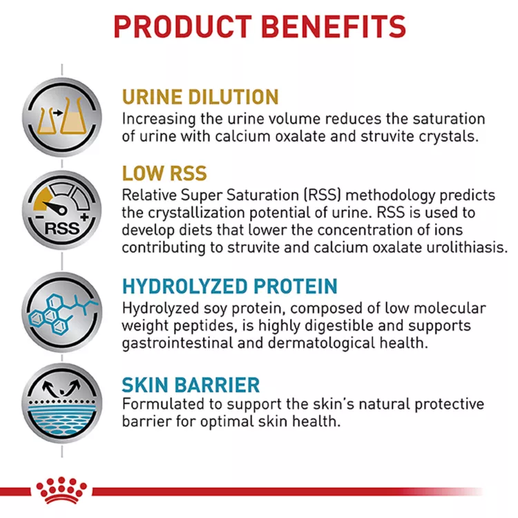 Constant trips outside. Peeing inside the house. Straining to even go at all. When your adult dog has urinary issues, easing his discomfort requires special care. But with the help of your veterinarian and Royal Canin, there's not just hope for urinary support - there can be a true difference. Whether this is your dog's first urinary issue or he has developed food sensitivities and needs ongoing urinary care, your vet recommended Royal Canin Urinary SO + Hydrolyzed Protein for a reason. This veterinary-exclusive dry dog food was developed to nutritionally support your adult dog's urinary tract and bladder health. It's designed with Relative SuperSaturation (RSS) methodology to help lower ion concentration in urine, which contributes to stone formation. This formula promotes a urinary environment unfavorable to the formation of both struvite and calcium oxalate crystals. It also features highly digestible hydrolyzed protein, which helps reduce the risk of stomach and skin signs in dogs with food sensitivities. Talk to your veterinarian about keeping your dog on this urinary dog food with Royal Canin Hydrolyzed Protein Treats for long-term urinary tract support. With over 50 years of scientific research and observation, Royal Canin continues to deliver targeted nutrition to feed every pet's magnificence.