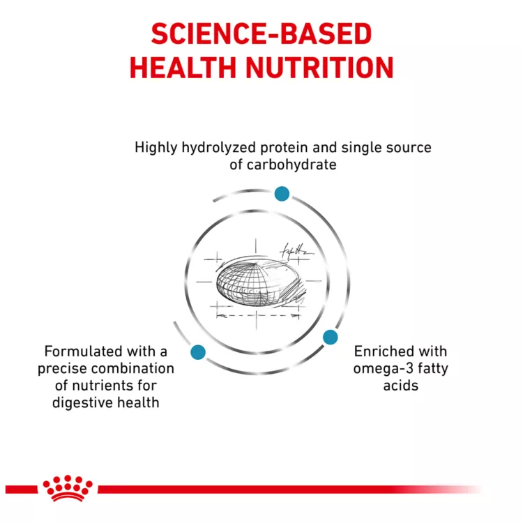 Royal Canin Hydrolyzed Protein Adult HP is made with hydrolyzed soy proteins to reduce the risk of triggering an immune reaction in your dog. Optimal amounts of B vitamins and amino acids reinforce your dog's skin barrier. Omega-3 fatty acids EPA and DHA help promote healthy skin and coat. Plus, an exclusive blend of fibers helps support digestive health in dogs prone to digestive upsets.