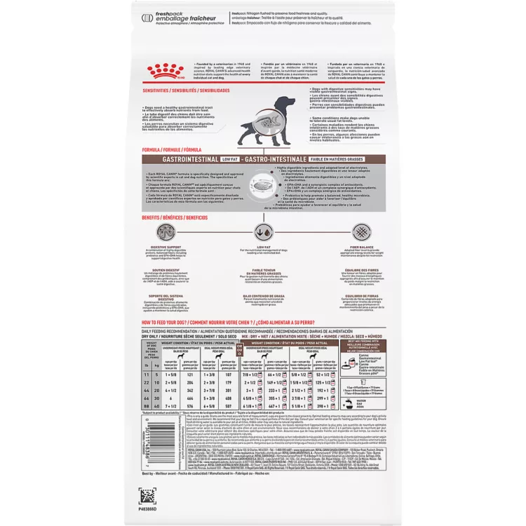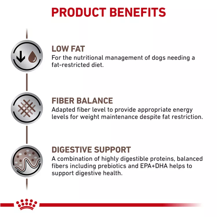 Royal Canin Veterinary Diet Gastrointestinal Low Fat Dry Dog Food is a palatable low-fat diet formulated for dogs with digestive sensitivities including difficulties digesting fat. It is also formulated with highly digestible proteins, tailored omega-3 fatty acids like EPA and DHA, and a fiber blend to support digestive health. The fiber blend includes highly fermentable prebiotic fibers to help support the microbiome and less fermentable fibers to support stool quality and regularity. Interested in a wet food complement? Ask your veterinarian about pairing this diet with Royal Canin Gastrointestinal Low Fat Wet Dog Food.